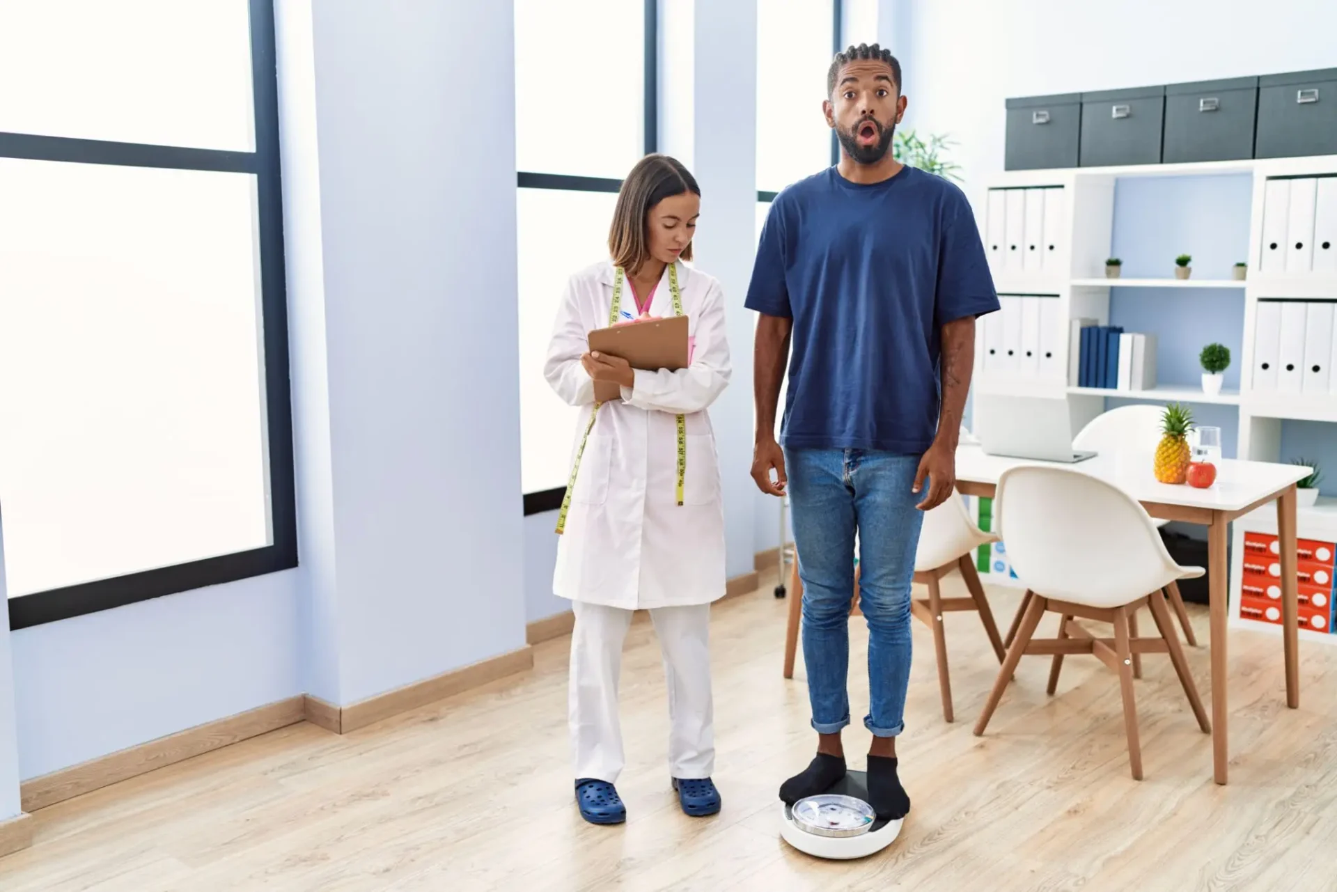 Doctor measuring patient's weight in a clinic.